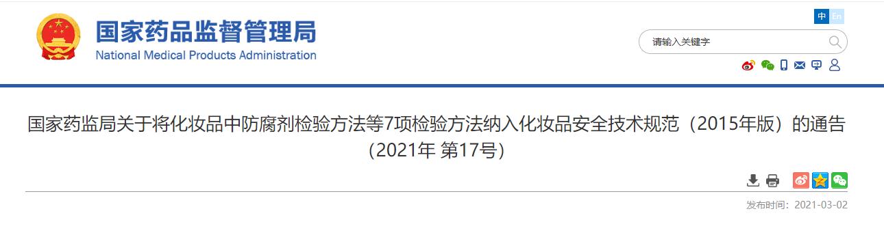 國家藥監局關于將化妝品中防腐劑檢驗方法等7項檢驗方法納入化妝品安全技術規范(2015年版)的通告(2021年 第17號)