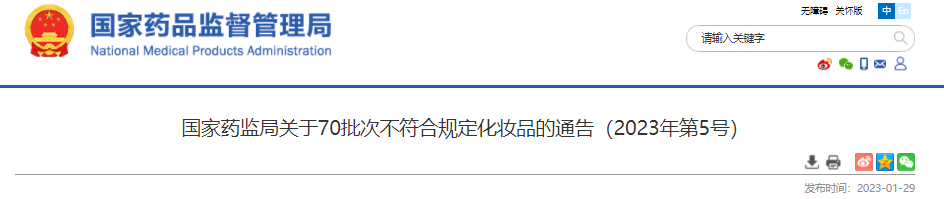 2023年1月19日,國家藥監局發布關于70批次不符合規定化妝品的通告(2023年第5號),具體通告內容如下: