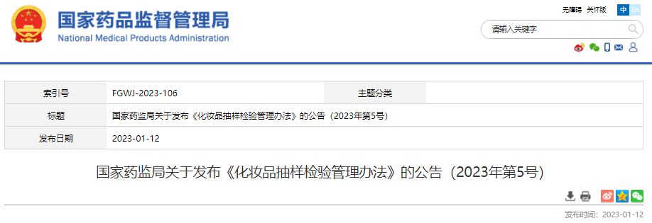 為加強化妝品監督管理,規范化妝品抽樣檢驗工作,根據《化妝品監督管理條例》《化妝品生產經營監督管理辦法》等法規、規章,國家藥監局組織制定了《化妝品抽樣檢驗管理辦法》,現予公布,自2023年3月1日起施行。