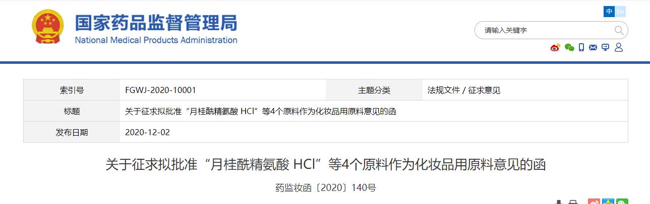 2020年12月1日,國家藥監局化妝品監管司根據《化妝品衛生監督條例》等有關規定,經化妝品審評專家委員會審評,月桂酰精氨酸HCl、甲氧基 PEG-23 甲基丙烯酸酯/甘油二異硬脂酸酯甲基丙烯酸酯共聚物、磷酰基寡糖鈣、硬脂醇聚醚-200等4個原料符合有關化妝品新原料的技術審評要求,擬批準其作為化妝品原料使用。