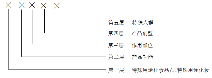 本標準規定了化妝品的分類和編碼。其適用于化妝品備案、注冊、管理和統計。在特殊用途化妝品、非特殊用途化妝品分類的基礎上,按產品功能、作用部位、產品劑型,同時考慮特殊人群,對化妝品進行細化分類。如圖一所示,分類編碼分五個層次。