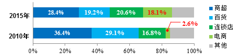 圖1 2010年與2015年化妝品銷售渠道規模對比
