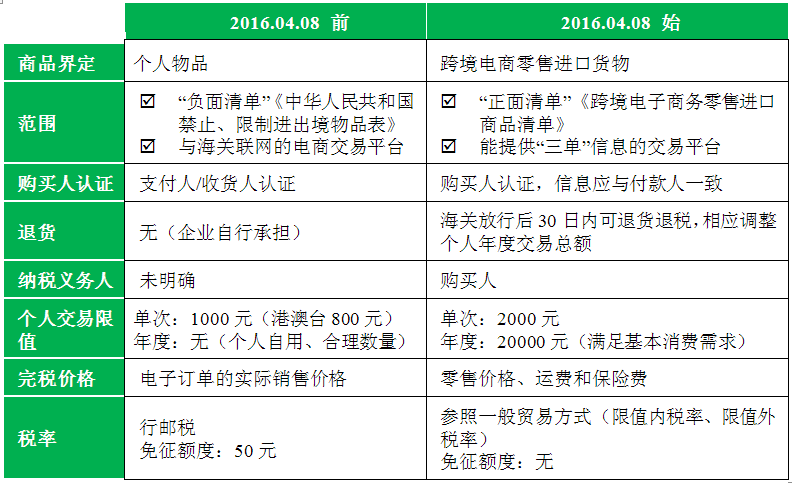 近期發布的“關于跨境電子商務零售進口稅收政策的通知(財關稅〔2016〕18號)”,于2016年4月8日正式實施,實施前后給行業帶來的變化如下:
