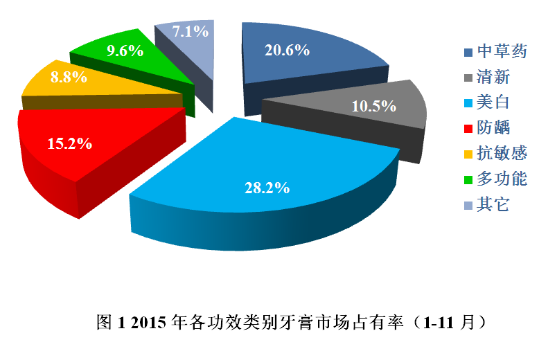 從2015年前11個月的牙膏市場占有率來看,中端和高端產品占比約為61%。消費者對高端化產品的訴求主要來自于其對產品功能的健康訴求。如圖1,盡管美白和防蛀等傳統牙膏功能依然占據了很大一部分市場,但是高端草本和多效口腔健康產品占比也不可小覷。