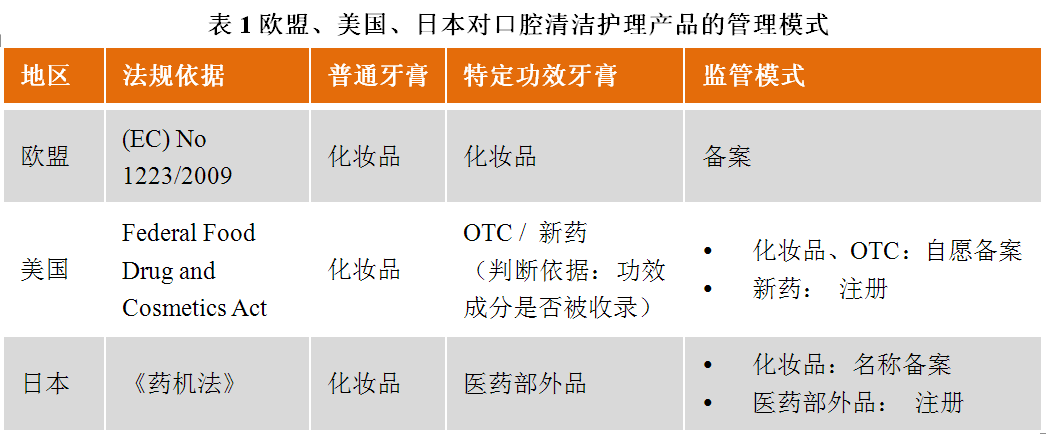 美國和日本根據功效宣稱對口腔清潔護理用品進行分類管理,且允許宣稱醫療術語。而歐盟則將這類產品納入了化妝品管理,詳見表1 分析。