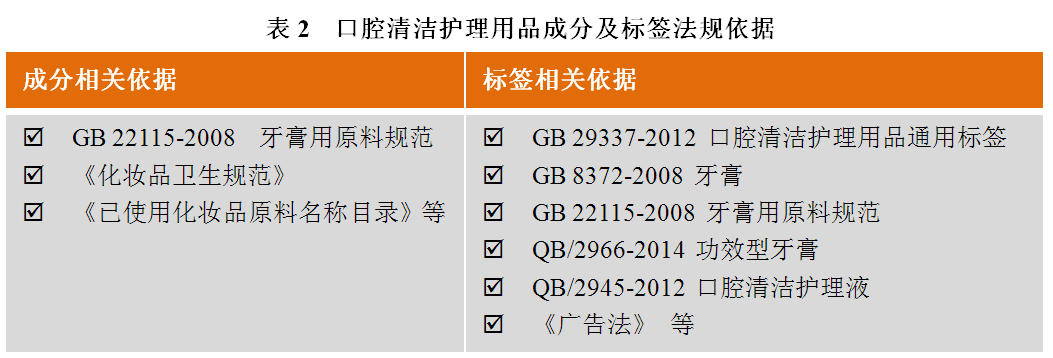 口腔清潔護理用品的主要使用目的是清潔和美化,符合《化妝品監督管理條例(修訂草案送審稿)》中化妝品的定義,因而也需綜合考慮相關化妝品法規。口腔清潔護理用品成分及標簽相關依據詳見表2。