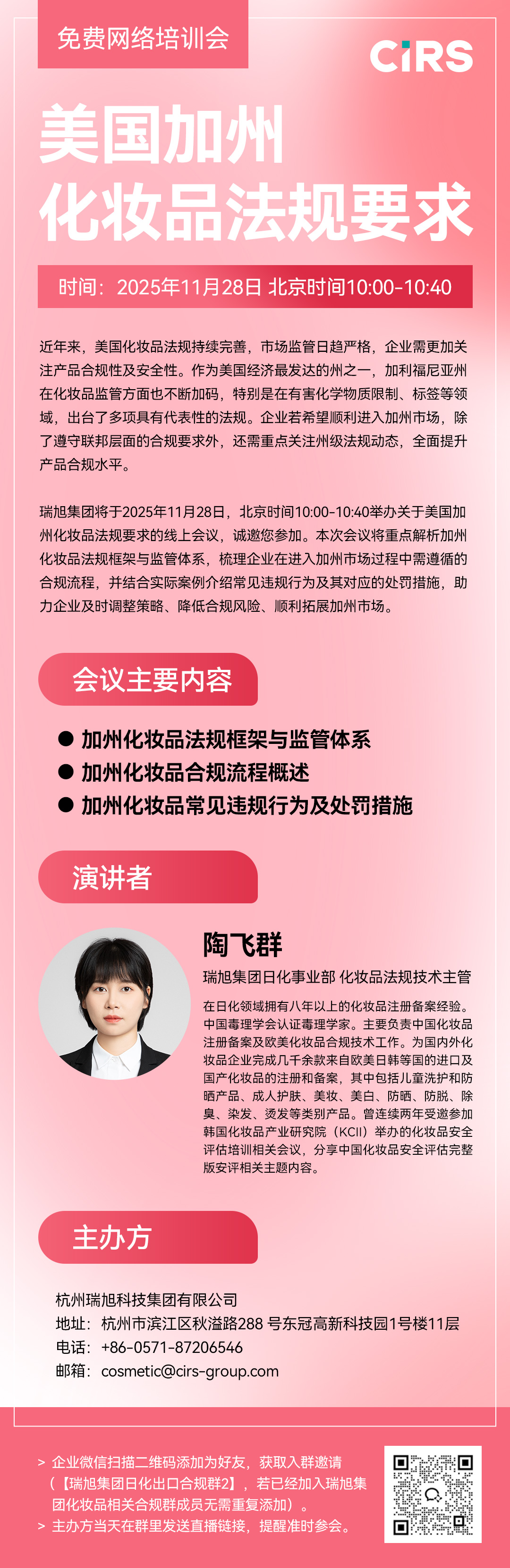瑞旭集團將于2025年11月28日,北京時間10:00-10:40舉辦關于美國加州化妝品法規要求的線上會議,誠邀您參加。本次會議將重點解析加州化妝品法規框架與監管體系,梳理企業在進入加州市場過程中需遵循的合規流程,并結合實際案例介紹常見違規行為及其對應的處罰措施,助力企業及時調整策略、降低合規風險、順利拓展加州市場。