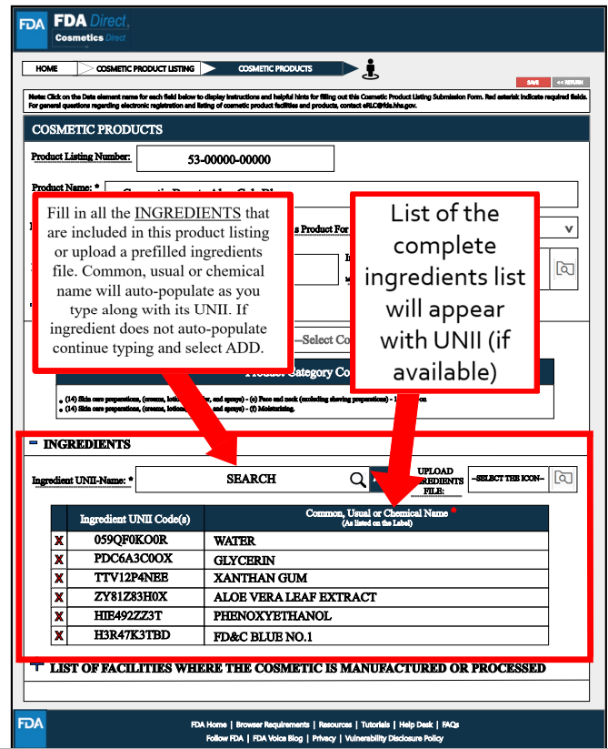 INGREDIENTS處,需要填寫清單中產品的所有成分信息,包括原料的名稱(按照美國的原料命名規則,可參考CIRS解讀“美國對化妝品用原料的管理”)以及UNII編號,但不需要填寫配方中原料使用的濃度信息。原料信息可通過文件上傳,但暫未說明文件格式要求。