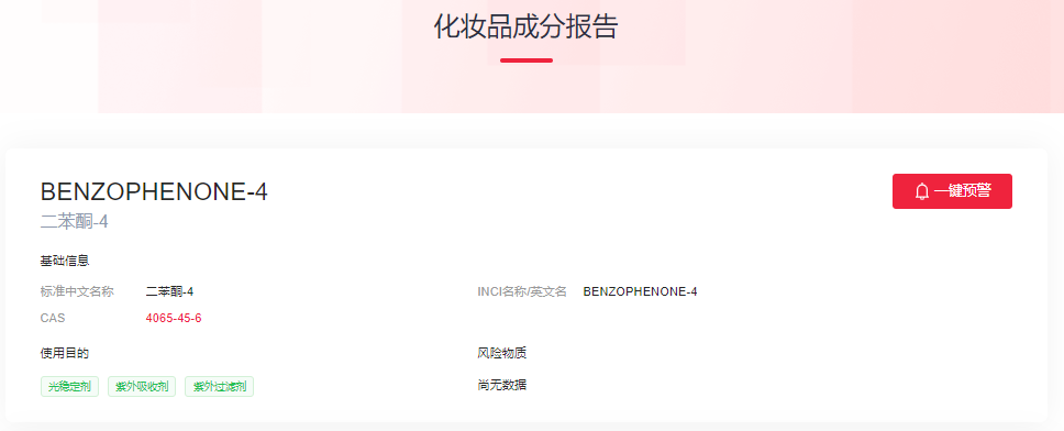 由瑞旭集團自主研發的中國化妝品原料法規數據庫(妝合規)查詢信息顯示:二苯酮-4在化妝品中用作光穩定劑、紫外吸收劑、紫外過濾劑,已納入中國《已使用化妝品原料目錄》(2021版),列入《化妝品安全技術規范》的準用防曬劑清單,用作防曬劑時二苯酮-4和二苯酮-5的最高允許使用濃度總量為5%(以酸計)。