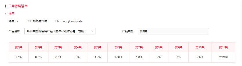 由瑞旭集團自主研發的中國化妝品原料法規數據庫(妝合規)查詢信息顯示:水楊酸芐酯常用作芳香劑、紫外吸收劑,已納入中國《已使用化妝品原料目錄》(2021版)、《日用香精準用清單》,淋洗類產品最高歷史使用量為0.37012%,駐留類產品最高歷史使用量為0.31575%。