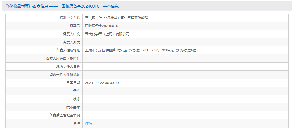 2024年2月22日獲得的備案號的新原料為三(聚甘油-3/月桂基)氫化三聚亞油酸酯,備案號國妝原備字20240016,備案企業為禾大化學品(上海)有限公司。