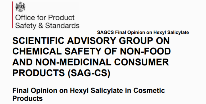 2025年11月,英國非食品與非醫藥消費產品化學安全科學咨詢組(SAG-CS)發布了關于水楊酸己酯(Hexyl Salicylate)在化妝品中使用的評估意見(Opinion 19)。