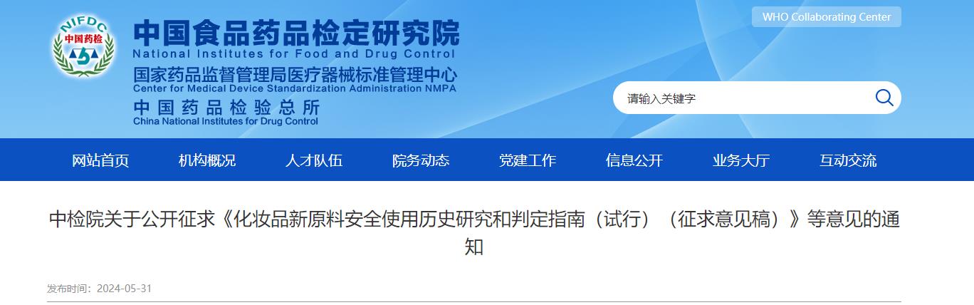 為規范化妝品新原料研究和評價,指導新原料安全使用及食用歷史相關資料的收集、判定以及在安全評估中的應用,根據《化妝品監督管理條例》《化妝品注冊備案管理辦法》《化妝品新原料注冊備案資料管理規定》等相關法規和配套文件要求,我院起草了《化妝品新原料安全使用歷史研究和判定指南(試行)(征求意見稿)》《化妝品新原料安全食用歷史研究和判定指南(試行)(征求意見稿)》2項技術文件及其起草說明(附件1~4),現公開向社會征求意見。反饋意見請填寫意見反饋表(附件5),并于2024年6月18日前發送電子郵件至hzppjzx@nifdc.org.cn。
