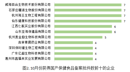 按備案人來看,10月共有43家企業獲得國產保健食品備案憑證。其中,威海百合生物技術股份有限公司、石家莊藏諾生物股份有限公司、杭州海王生物工程有限公司和仙樂健康科技股份有限公司分別拿到7個批件,獲批數量最多。