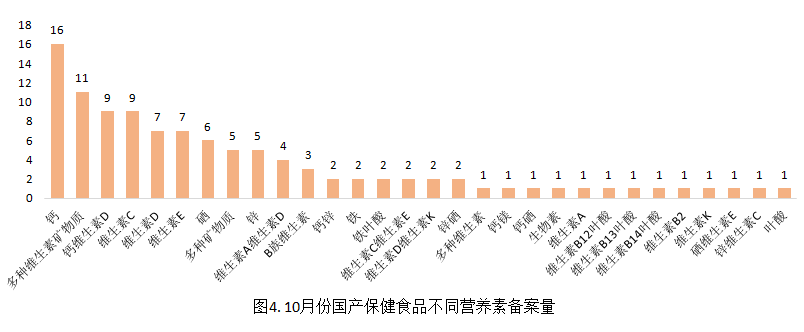 按營養素來看,10月獲得備案憑證的國產保健食品中,補充鈣的產品最多,占10月獲批總量的14.95%;其次數量較多的為補充多種維生素礦物質的產品,占10月獲批總量的10.28%;補充兩種營養素的產品中,以補充鈣和維生素D的產品居多。