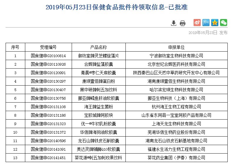 • 2019年第二批獲得注冊批件的13款保健食品