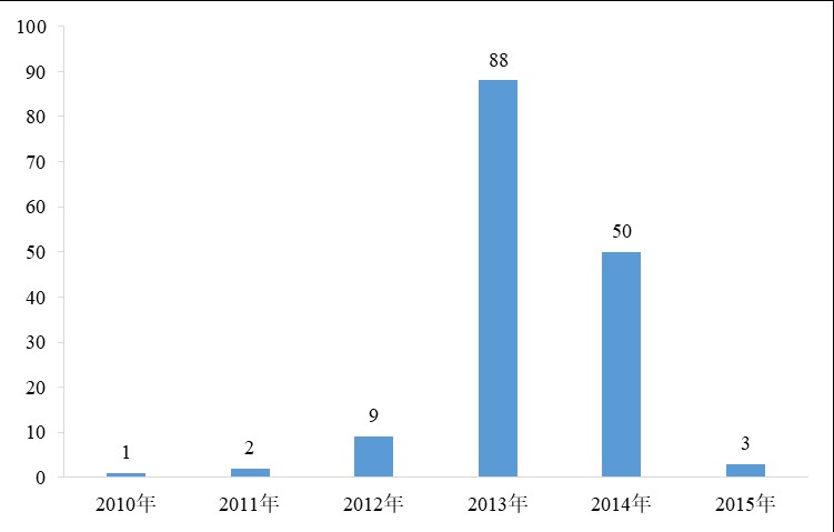 在獲得新產品注冊批件的153款保健食品受理時間覆蓋2010-2015年,其中,2013年受理的產品獲批數量最多,共有88款,占保健食品注冊總量的57.52%;其次為2014年受理的產品,為50款,占保健食品注冊總量的32.68%。總體來看,此前積壓數年的產品正在陸續得以解決。