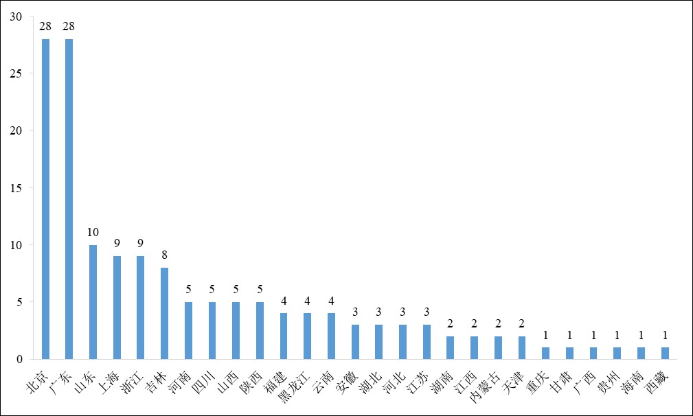 保健食品各地區(省、直轄市、自治區)注冊情況千差萬別,其中北京市和廣東省獲得注冊批件的產品均為28款,獲批數量并列第一,分別占保健食品注冊總量的18.67%和18.67%(有3款保健食品未公布申報單位,不計入統計)。