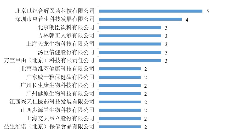 已注冊保健食品分別來自125家保健食品企業,其中北京世紀合輝醫藥科技有限公司共有5款保健食品獲得注冊批件,獲批數量最多;深圳市惠普生科技發展有限公司共有4款保健食品獲得注冊批件,獲批數量位居次席(有3款保健食品未公布申報單位,不計入統計)。