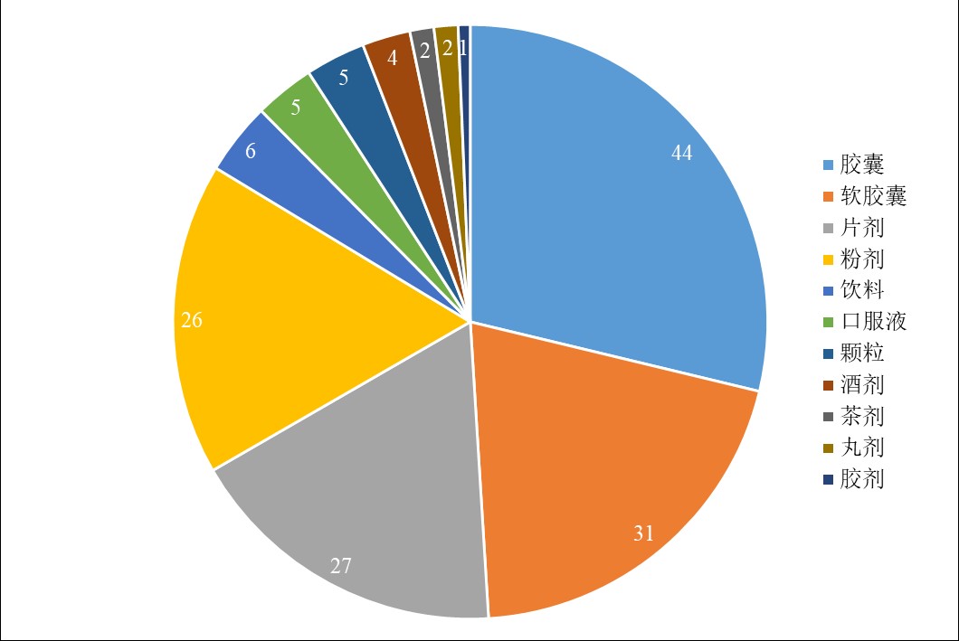 已注冊保健食品的劑型包括膠囊、軟膠囊、片劑、粉劑、飲料、口服液、顆粒、酒劑、茶劑、丸劑和膠劑。其中,膠囊類產品的獲批數量最多,為44款,占保健食品注冊總量的28.76%;此外,軟膠囊、片劑和粉劑類產品的獲批數量較多,分別為31款、27款和26款,分別占保健食品注冊總量的20.26%、17.65%和16.99%。