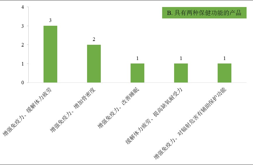 在已公布保健功能的120款產品中,具有一種保健功能的產品共112款,其中保健功能為增強免疫力的產品最多,達80款,占該類產品總量的71.43%;具有兩種保健功能的產品共8款,其中保健功能為增強免疫力、緩解體力疲勞的產品最多,為3款,占該類產品總量的37.50%。