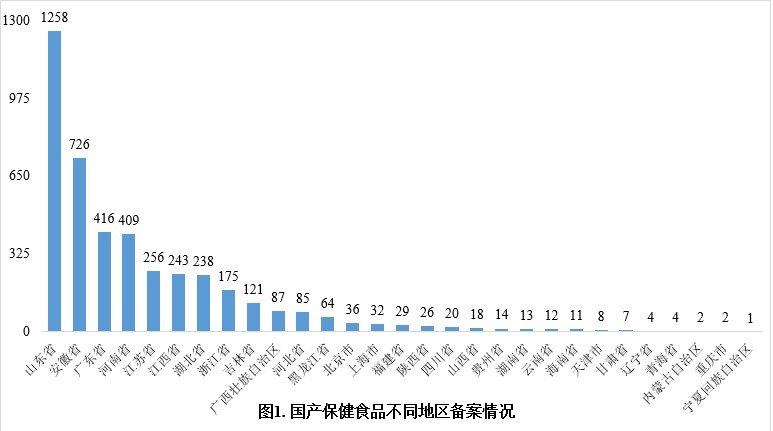 國產保健食品各地區(省、直轄市、自治區)的備案情況千差萬別。其中,山東省共獲得1258款保健食品備案憑證,備案數量居于首位;安徽省和廣東省分別獲得726款和416款保健食品備案憑證,備案數量分列第二和第三位。
