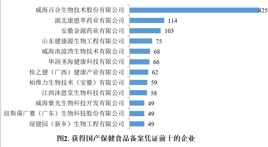 已備案的國產保健食品分別來自602家企業。其中威海百合生物技術股份有限公司共425款保健食品獲得備案憑證,備案數量最多;湖北康恩萃藥業有限公司共114款保健食品獲得備案憑證,備案數量位居次席;安徽金源藥業有限公司有103款保健食品獲得備案憑證,位居第三。
