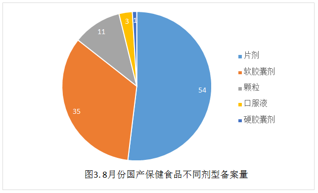按劑型來看,獲得備案憑證的國產保健食品中,片劑劑型最多,占8月獲批總量的51.92%。