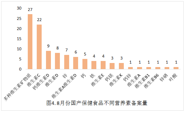 按營養素來看,獲得備案憑證的國產保健食品中,補充多種維生素礦物質的產品最多,占8月獲批總量的25.96%。補充單一營養素的產品中,補充維生素C的產品居多。補充兩種營養素的產品中,補充鈣和維生素D的產品居多。