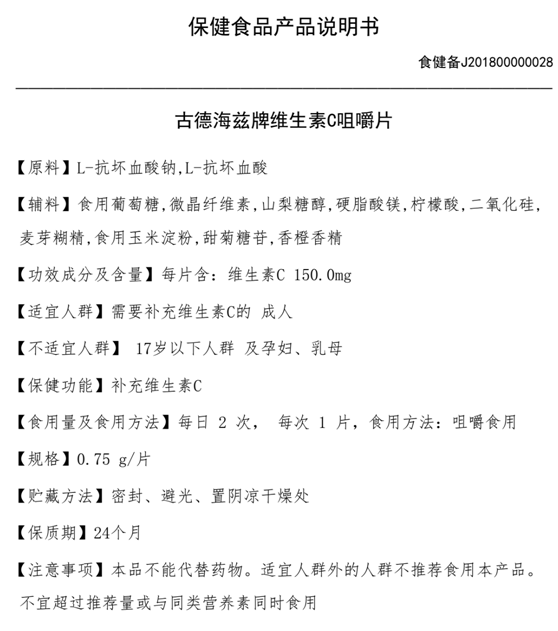 2.古德海茲牌維生素C咀嚼片(食健備J201800000028)