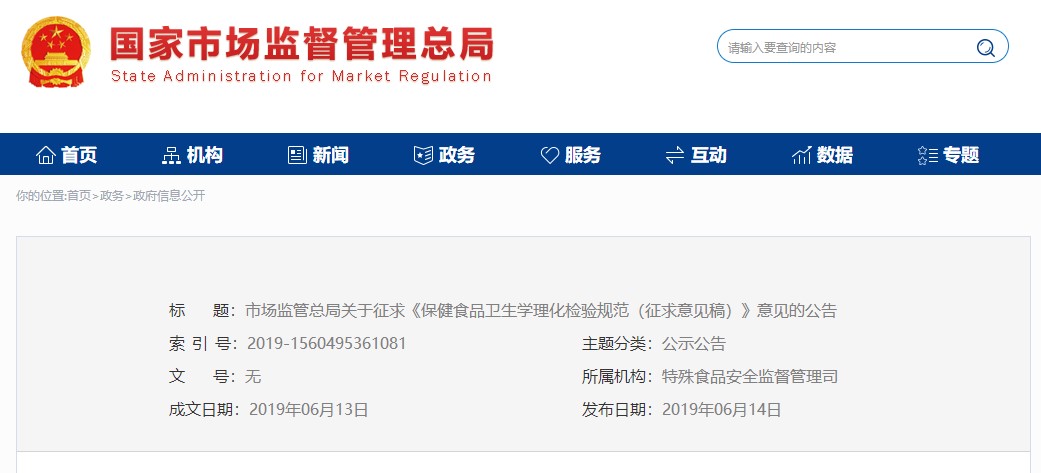 2019年6月13日,國家市場監督管理總局發布關于征求《保健食品衛生學理化檢驗規范(征求意見稿)》意見的公告,公告原文如下: