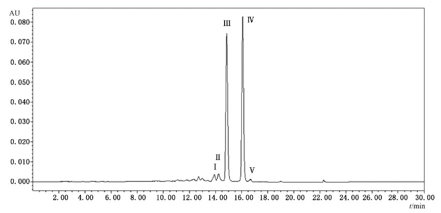 色譜條件與測定方法 用十八烷基硅烷鍵合硅膠為填充劑;色譜柱規格:4.6 mm×150 mm5 μm;流動相為甲醇:0.1%三氟乙酸水溶液=35:65。檢測波長:222 nm;流速:1.0 mL/min;進樣量:10μL。將上述溶液依次注入高效液相色譜儀,記錄色譜圖。以保留時間定性,分別測量對照品和供試品溶液峰面積。