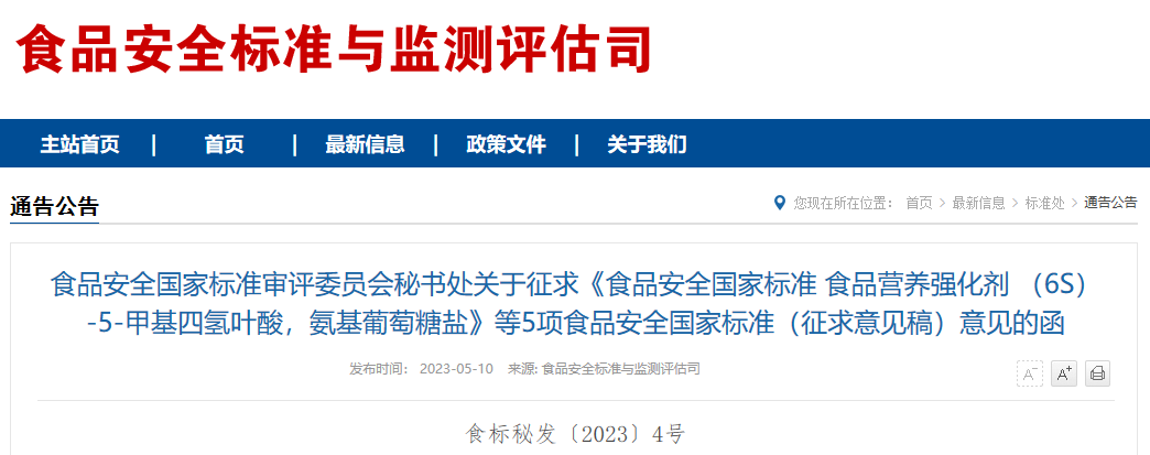 根據《食品安全法》及其實施條例規定,我委組織起草了《食品安全國家標準食品營養強化劑(6S)-5-甲基四氫葉酸,氨基葡萄糖鹽》等5項食品安全國家標準和修改單(征求意見稿),現向社會公開征求意見。請于2023年6月30日前登錄食品安全國家標準管理信息系統,在線提交反饋意見。