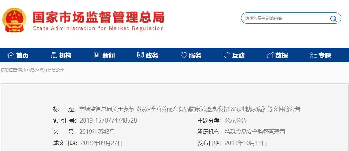 2019年10月11日,國家市場監督管理總局正式發布了《特定全營養配方食品臨床試驗技術指導原則 糖尿病》,《特定全營養配方食品臨床試驗技術指導原則 腎病》,以及《特定全營養配方食品臨床試驗技術指導原則 腫瘤》,并且宣布自發布之日起予以實施。由于《特殊醫學用途配方食品通則》(GB 29922)的問答對此三類產品的營養素可調整范圍作了規定,因此作為法規依據,可以認為其已具備生產研發以及注冊工作的條件。而隨著醫學研究的深入以及法規體系的完善,不排除各營養素指標在后續的特定全營養產品標準中的進一步調整。例如,在GB 29922的問答中,要求腫瘤特定全營養配方食品的優質蛋白質不少于50%,而《腫瘤全營養配方食品》征求意見稿中則提到其應為全優質蛋白等。