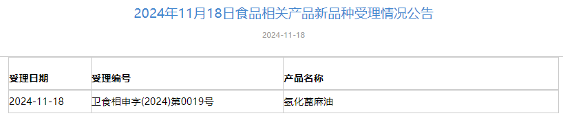 2024年11月1日-2024年11月29日,國家衛生健康委員會政務服務平臺發布三新食品受理情況,新增3款新食品原料受理,新增4款食品相關產品新品種受理,新增5款食品添加劑新品種受理。