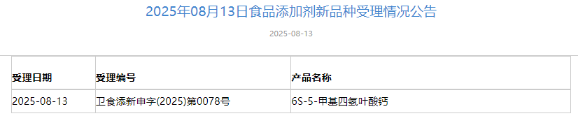 5 | 2025-08-13 | 衛食添新申字(2025)第0078號 | 6S-5-甲基四氫葉酸鈣 |