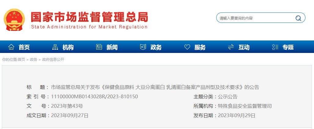 根據《中華人民共和國食品安全法》《保健食品原料目錄 大豆分離蛋白》《保健食品原料目錄 乳清蛋白》,市場監管總局制定了《保健食品原料 大豆分離蛋白 乳清蛋白備案產品劑型及技術要求》,現予公告,自2023年10月1日起施行。