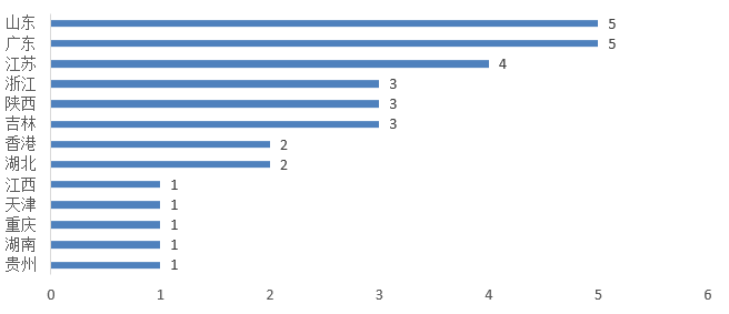 2025年上半年注冊批準的32款特醫食品共來自13個省份地域,其中山東、廣東和江蘇分別以5款、5款和4款的數量位列前三,占獲批總數的16%、16%和13%。具體省份地域及數據見下圖5。