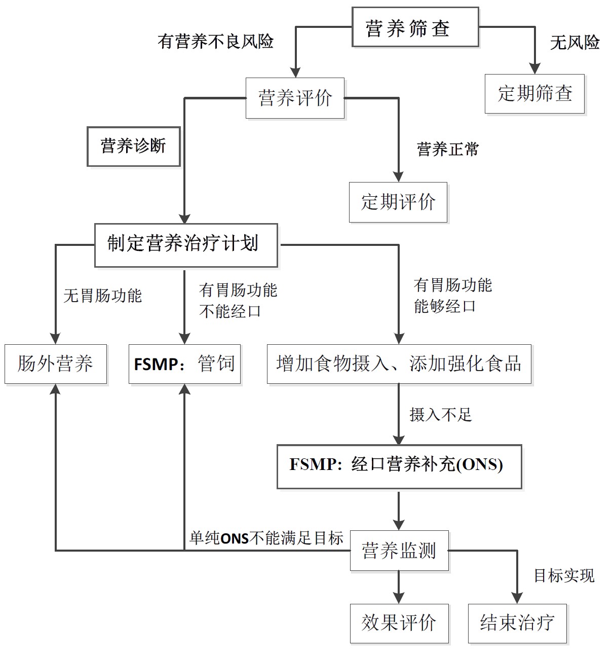 特殊醫學用途配方食品應由醫師或臨床營養師按照營養診療流程進行營養篩查及評價,根據結果明確營養相關問題、病因并做出營養診斷。對于滿足3.1適應證且不符合3.2禁忌證的病人,結合個體情況,制定營養治療方案及特殊醫學用途配方食品處方。通過營養監測定期對其效果開展評價,調整營養治療方案(參見附錄B)。