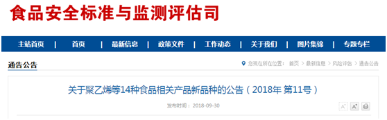 國家衛生健康委食品安全標準與監測評估司于2018年9月30日發布關于聚乙烯等14種食品相關產品新品種的公告,其中包括2種食品接觸材料及制品用添加劑新品種,7種擴大使用范圍的食品接觸材料及制品用添加劑,5種食品接觸材料及制品用樹脂新品種,相關信息如下: