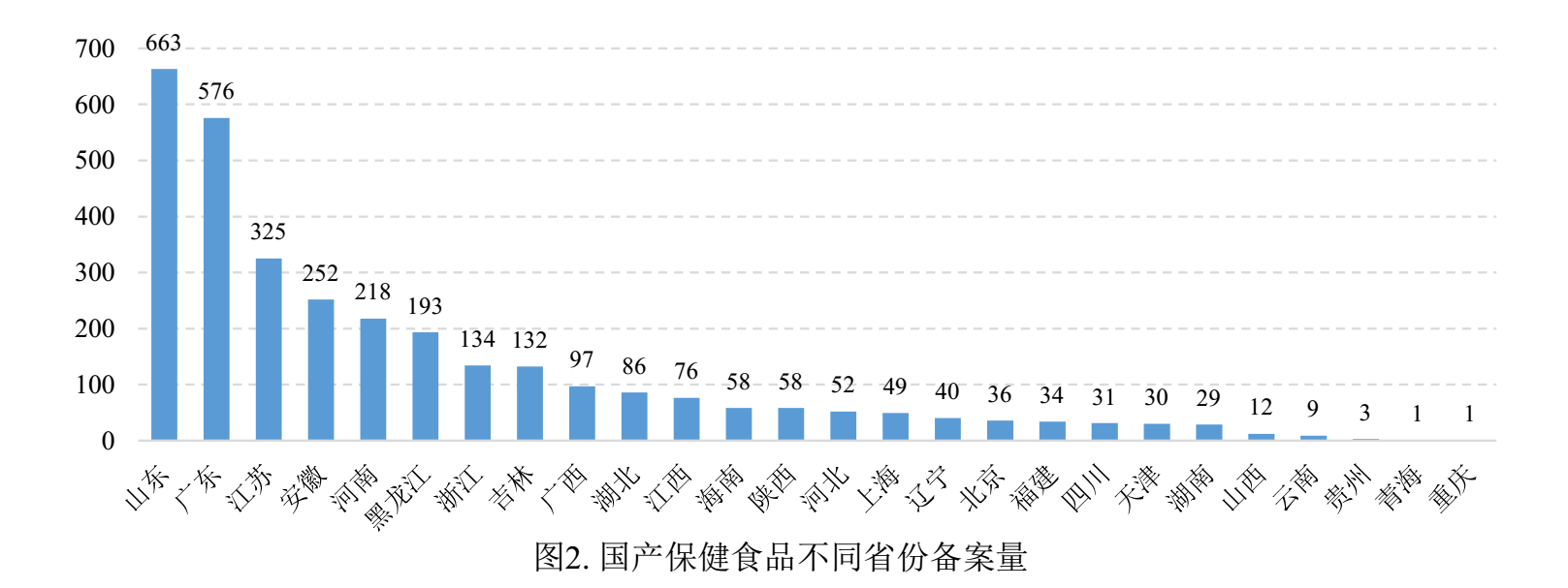 國產保健食品各省備案情況千差萬別,其中山東省和廣東省獲得備案憑證的產品分別為663款和576款,備案數量位列第一和第二位,分別占據全國備案產品總量的20.75%和18.03%。