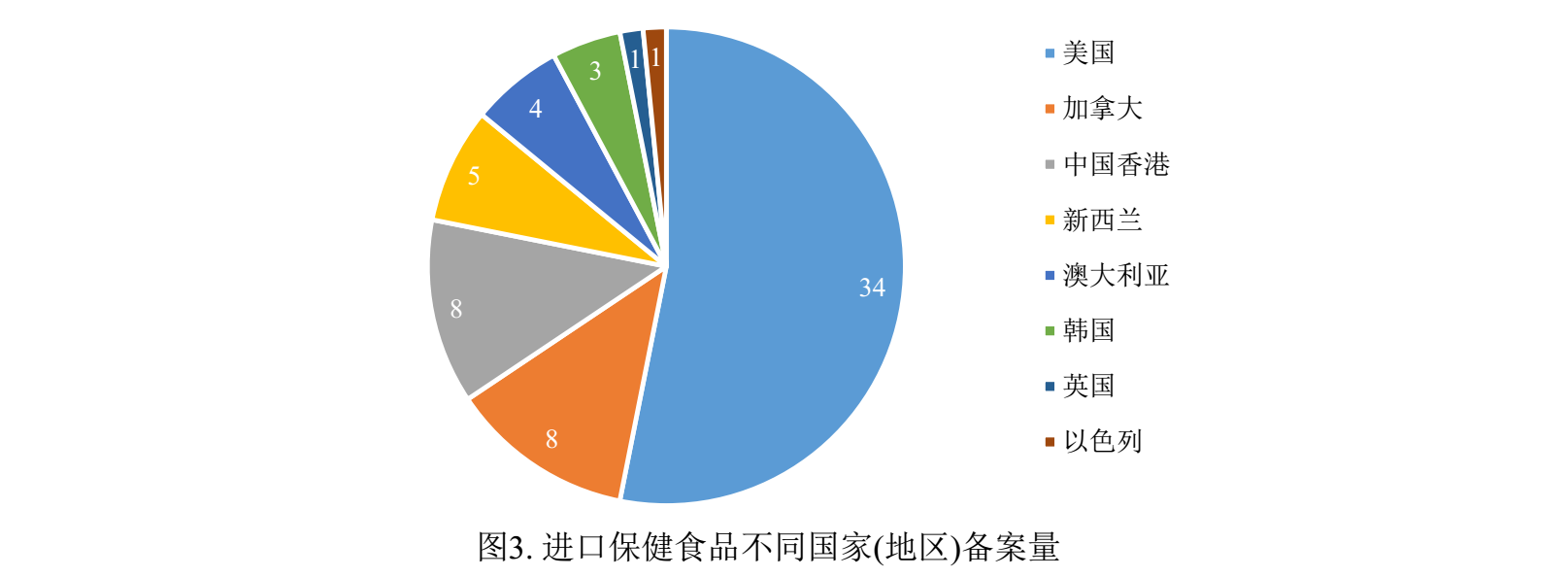 對于進口保健食品而言,獲得備案憑證的產品其備案人分別來自于美國、加拿大、中國香港、新西蘭、澳大利亞、韓國、英國和以色列8個國家/地區,并且64款已備案產品中34款產品的備案人為美國企業。而生產國為英國和以色列的保健食品均為2019年首次獲得備案憑證。