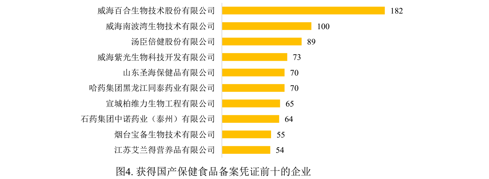 已備案的國產保健食品分別來自363家企業。其中威海百合生物技術股份有限公司共182款保健食品獲得備案憑證,備案數量最多;威海南波灣生物技術有限公司共100款保健食品獲得備案憑證,備案數量位居次席;湯臣倍健股份有限公司有89款保健食品獲得備案憑證,位居第三。