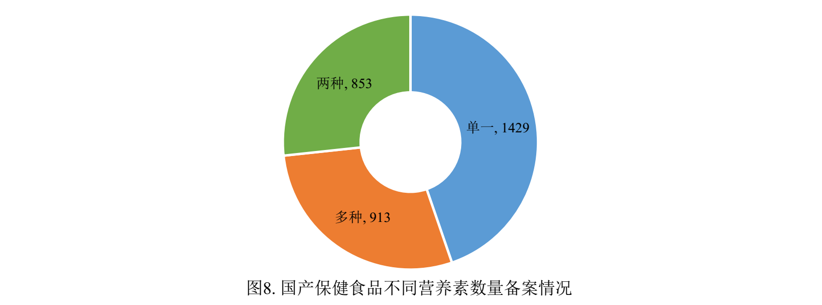 已備案的國產保健食品中補充單一營養素的產品最多,備案數量為1429款,其次為補充多種營養素和補充兩種營養素的產品。