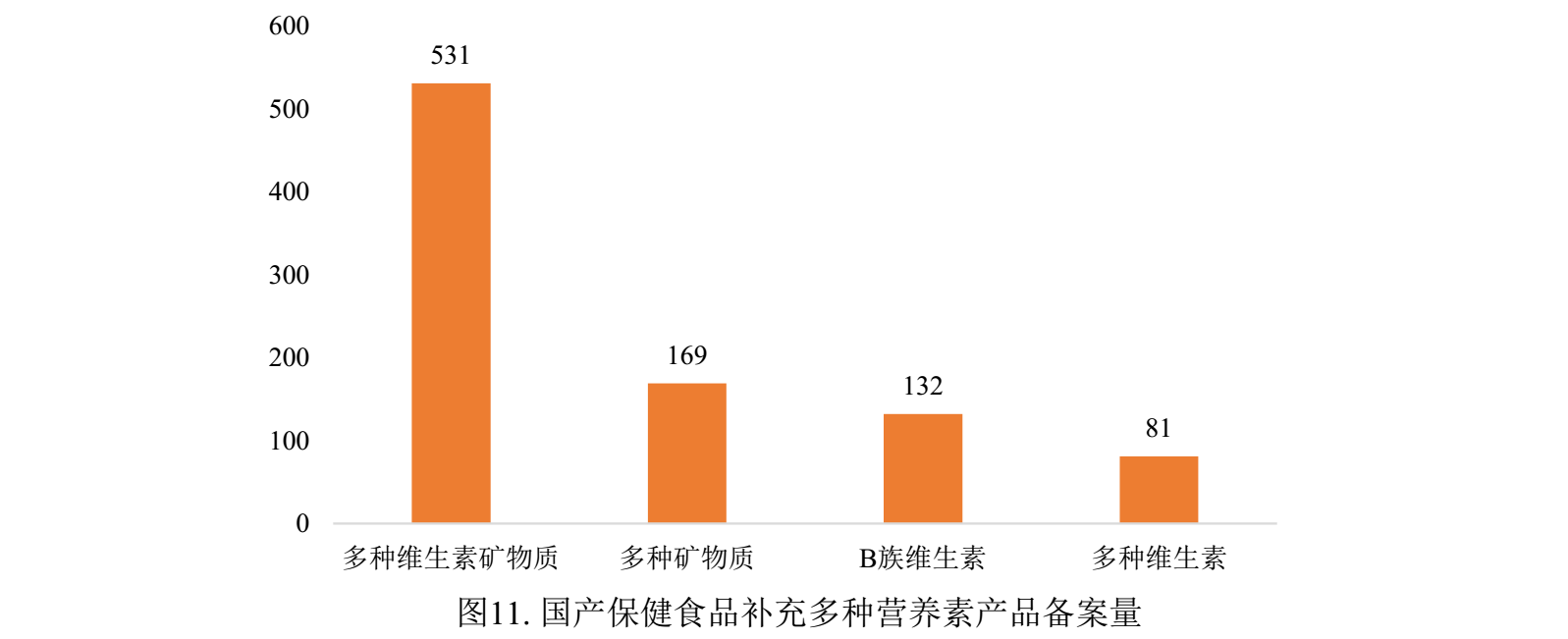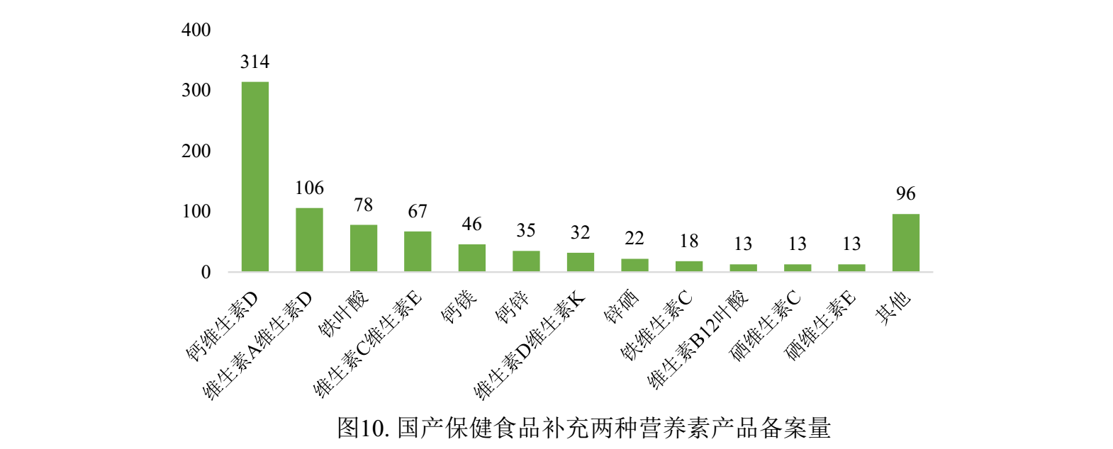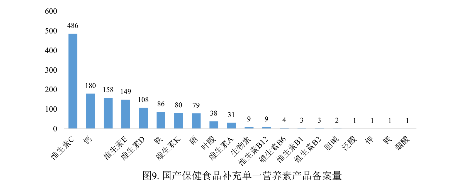 國產備案產品中補充多種維生素礦物質的產品、補充維生素C的產品和補充鈣和維生素D的產品為三大主流產品,備案數量分別為531款、486款和314款。