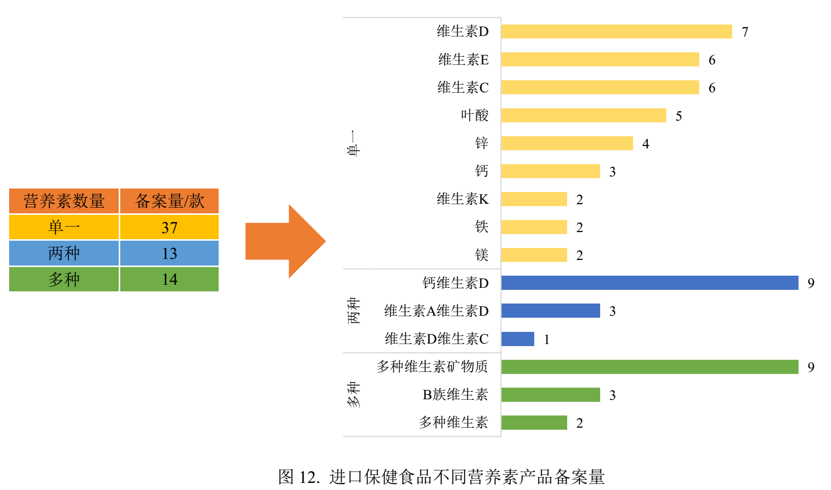 已備案進口保健食品中補充多種維生素礦物質的產品、補充鈣和維生素D的產品和補充維生素D的產品為三大主流產品,備案量分別為9款、9款和7款。