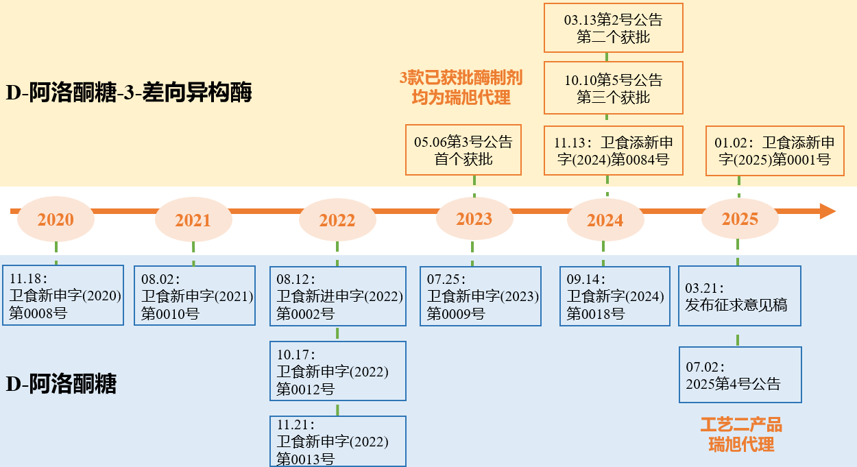 其中,工藝二產品及其允許使用的D-阿洛酮糖-3-差向異構酶均由瑞旭集團代理申報。D-阿洛酮糖-3-差向異構酶于2023年5月正式公告,是該酶制劑在我國的首次批準。
