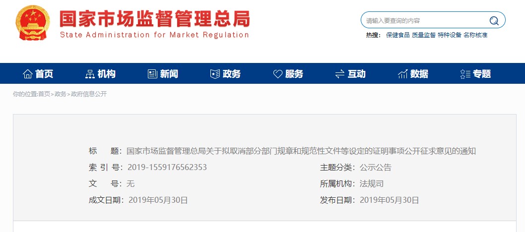 5月30日,國家市場監管總局發布《市場監管總局關于取消部分部門規章和規范性文件等設定的證明事項的決定(征求意見稿)》向公眾征求意見,擬取消部門規章設定的證明事項32項,部門規范性文件等設定的證明事項72項。意見反饋截止日期為2019年6月29日。