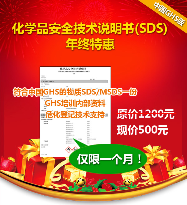 為幫助廣大生產企業實現化工安全生產標準化,順利完成危險化學品登記,瑞旭技術特推出符合中國GHS的化學品安全技術說明書(SDS)年終優惠活動。如果您的產品是列入《危險化學品目錄》中的物質,即可享受以上超值優惠價格!