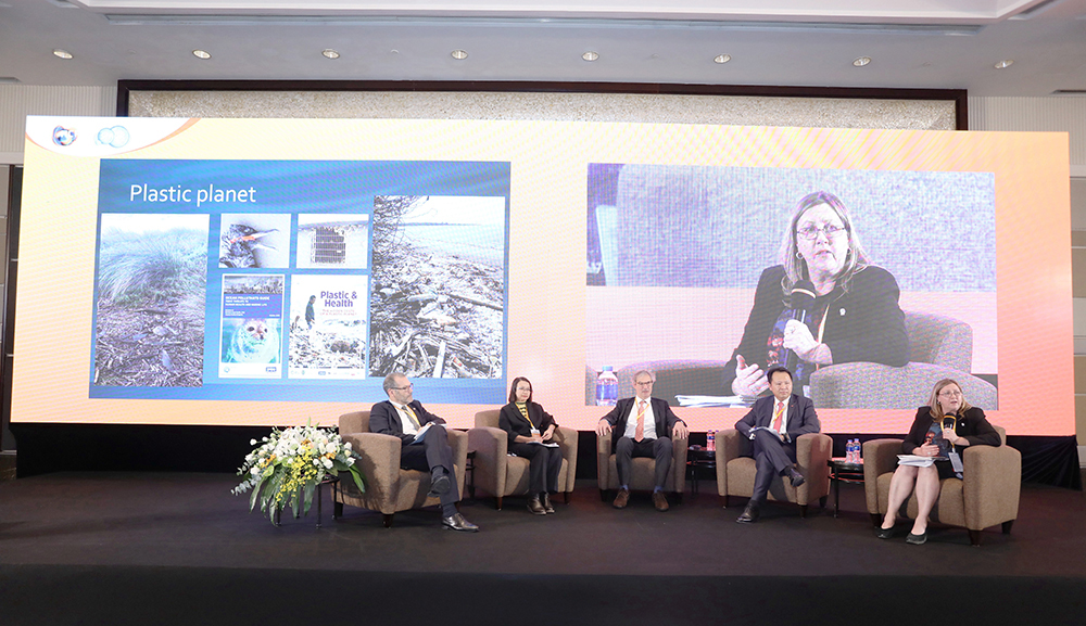 聯合國環境規劃署經濟部 (UNEP) Tim Kasten副總監及小組成員泰國污染控制署高級科學家Pornpimon Chareonsong,終止塑料垃圾聯盟(Alliance to End Plastic Waste)Yoke Loon Lim,有機污染物聯盟(IPEN)塑料顧問Jane Bremmer,歐洲化學品管理署(ECHA)部門主管Erwin Annys從塑料污染的現狀及政策制定發展原則發起討論,就如何增加循環性,減少微塑料特定使用等進行討論并呼吁各國對可持續解決方案都需要承擔起相應的責任。